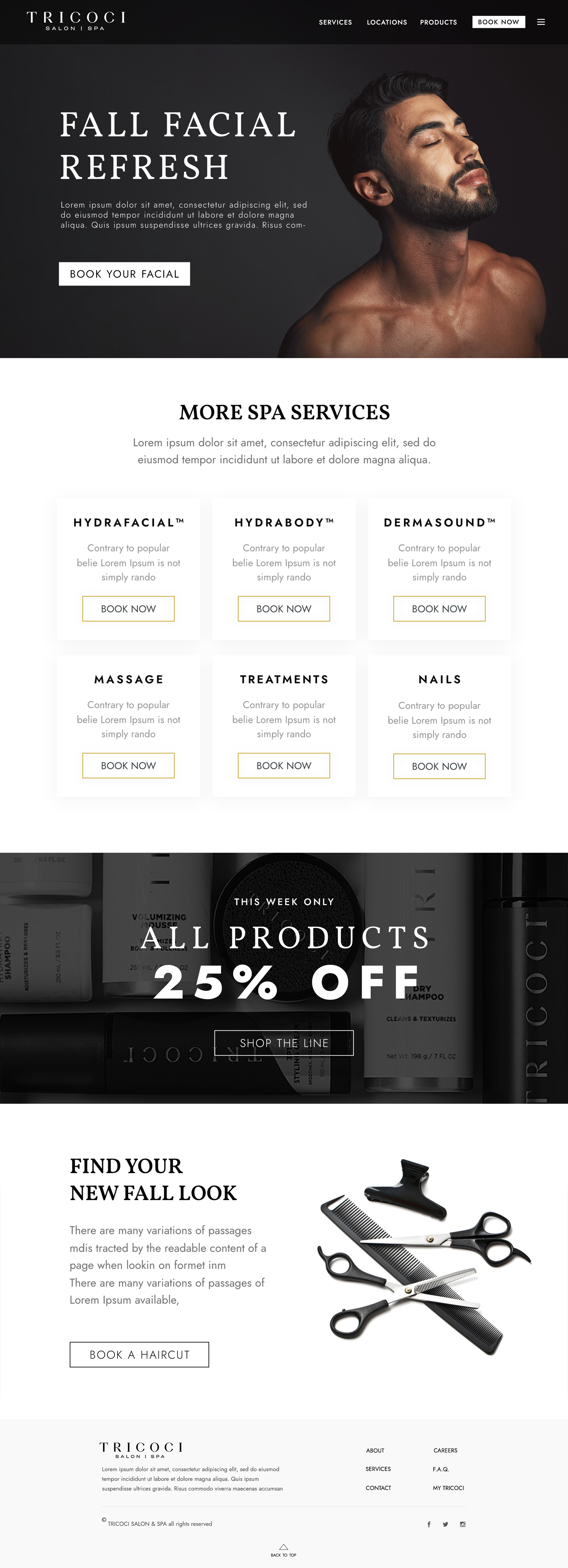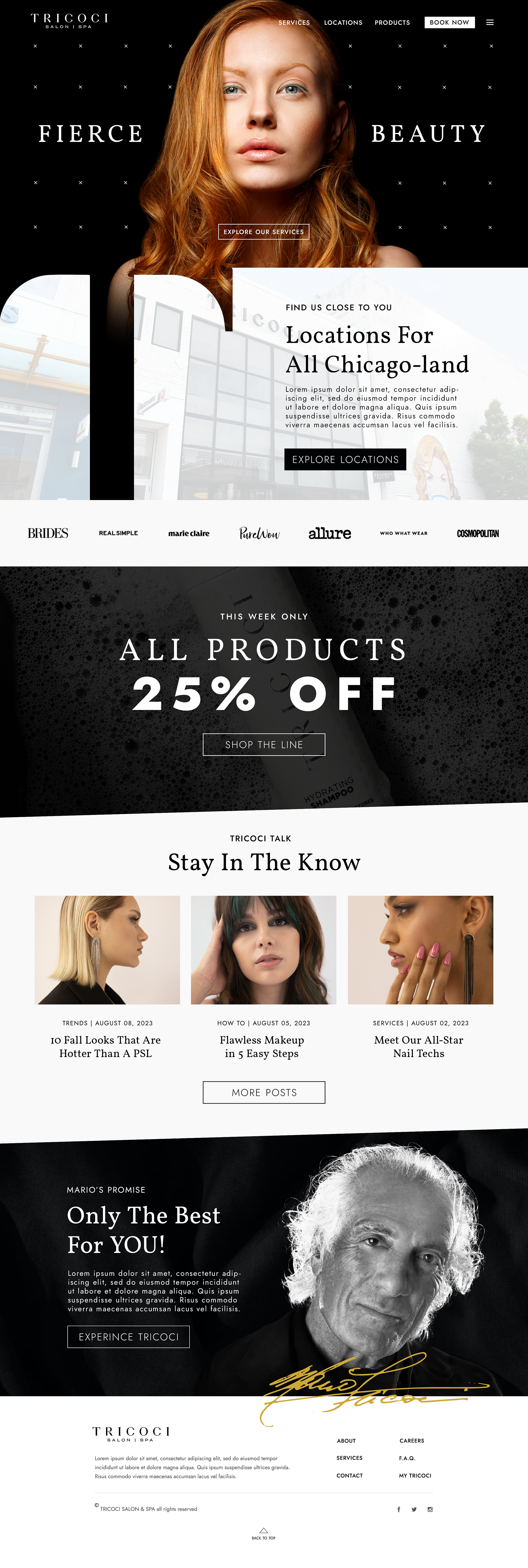 The Tricoci Salon website concept was designed to convey a modern, luxurious brand experience, with a bold, refined aesthetic that aligns with Tricoci’s commitment to beauty and quality. The layout features a striking hero section with bold typography and high-quality imagery, inviting users to explore Tricoci’s services. A location finder emphasizes accessibility across Chicagoland, while a promotions section showcases limited-time offers, encouraging product engagement. The "Tricoci Talk" blog area provides beauty trends, tutorials, and staff highlights to foster community and keep users informed. A personalized message from founder Mario Tricoci reinforces the brand’s dedication to excellence. The clean footer offers essential links, enhancing navigation and brand connectivity. This concept balances visual appeal with functionality, creating an inviting and cohesive user experience that reflects Tricoci’s premium identity.